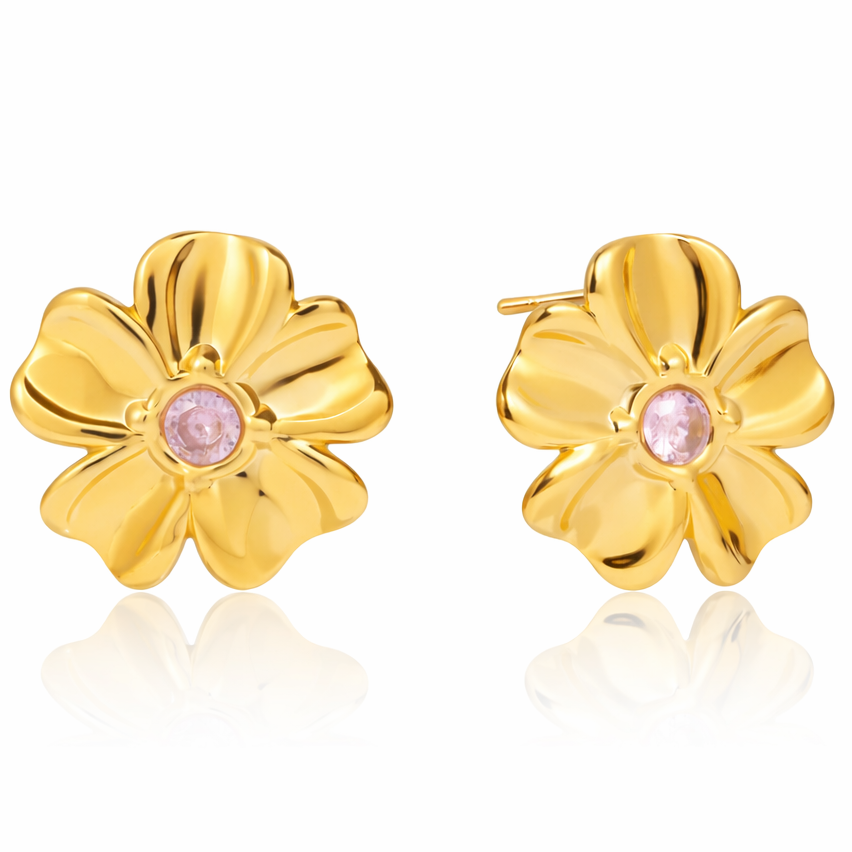 The Melina Earrings feature a sculpted gold flower design with softly contoured petals and a...