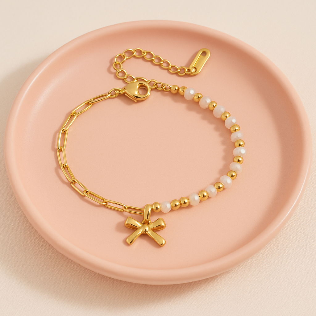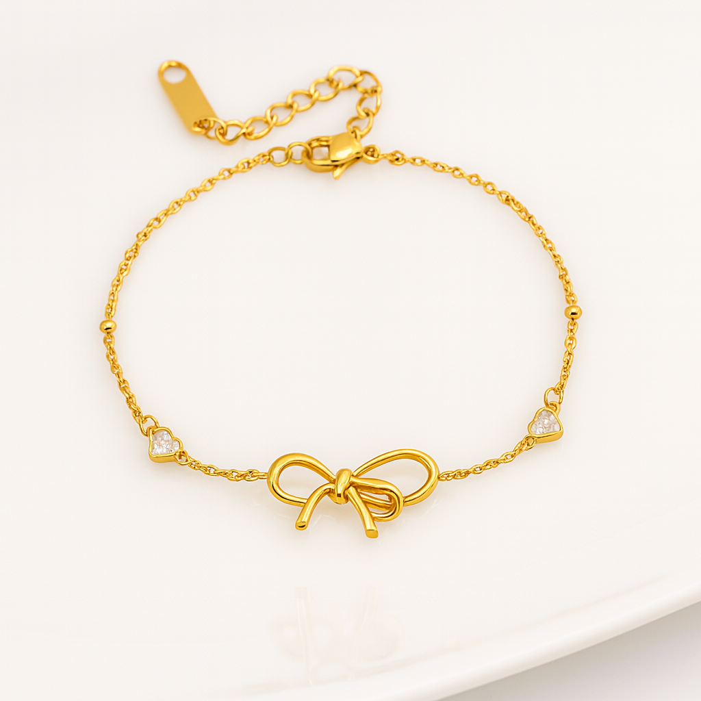 The Karman Bowtie Bracelet blends chic elegance with a playful twist. Featuring a dainty mix...