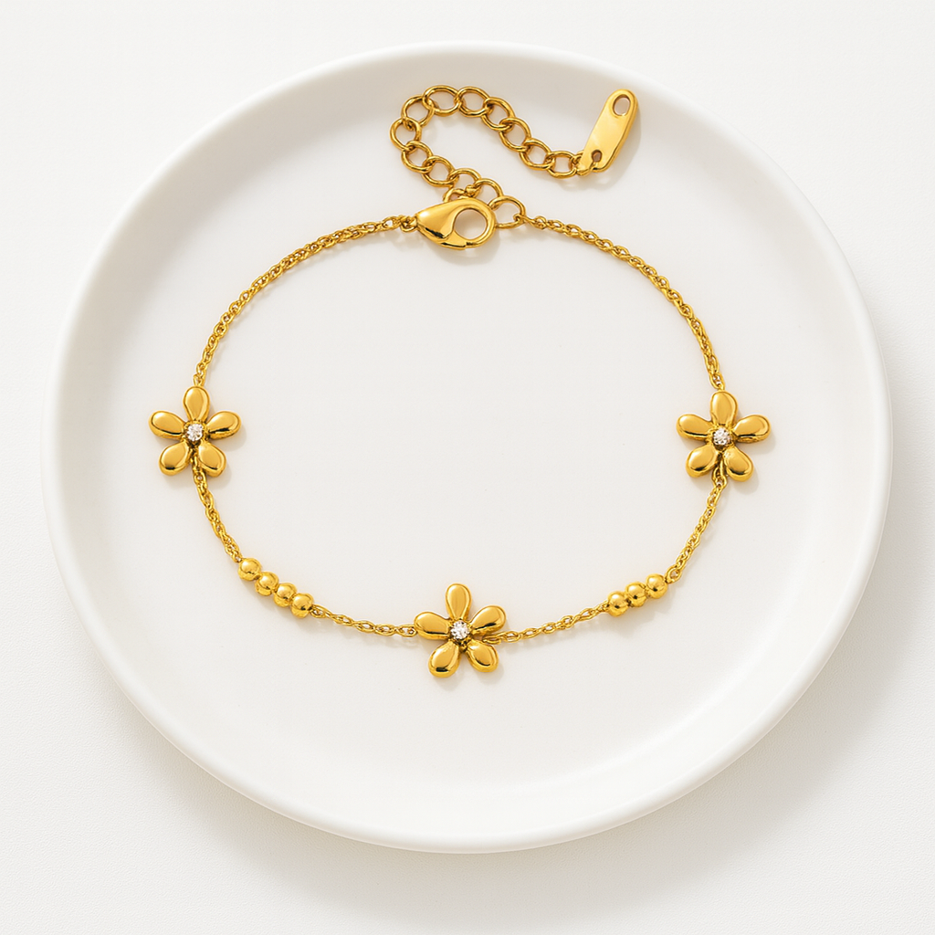 The Lily Bracelet features delicate gold flower charms accented with sparkling crystals, creating a soft...