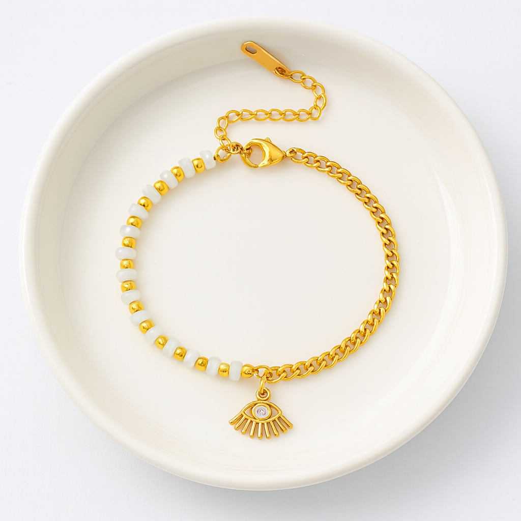The Saria Bracelet blends delicate white-and-gold beads with a sleek gold chain, creating a soft...