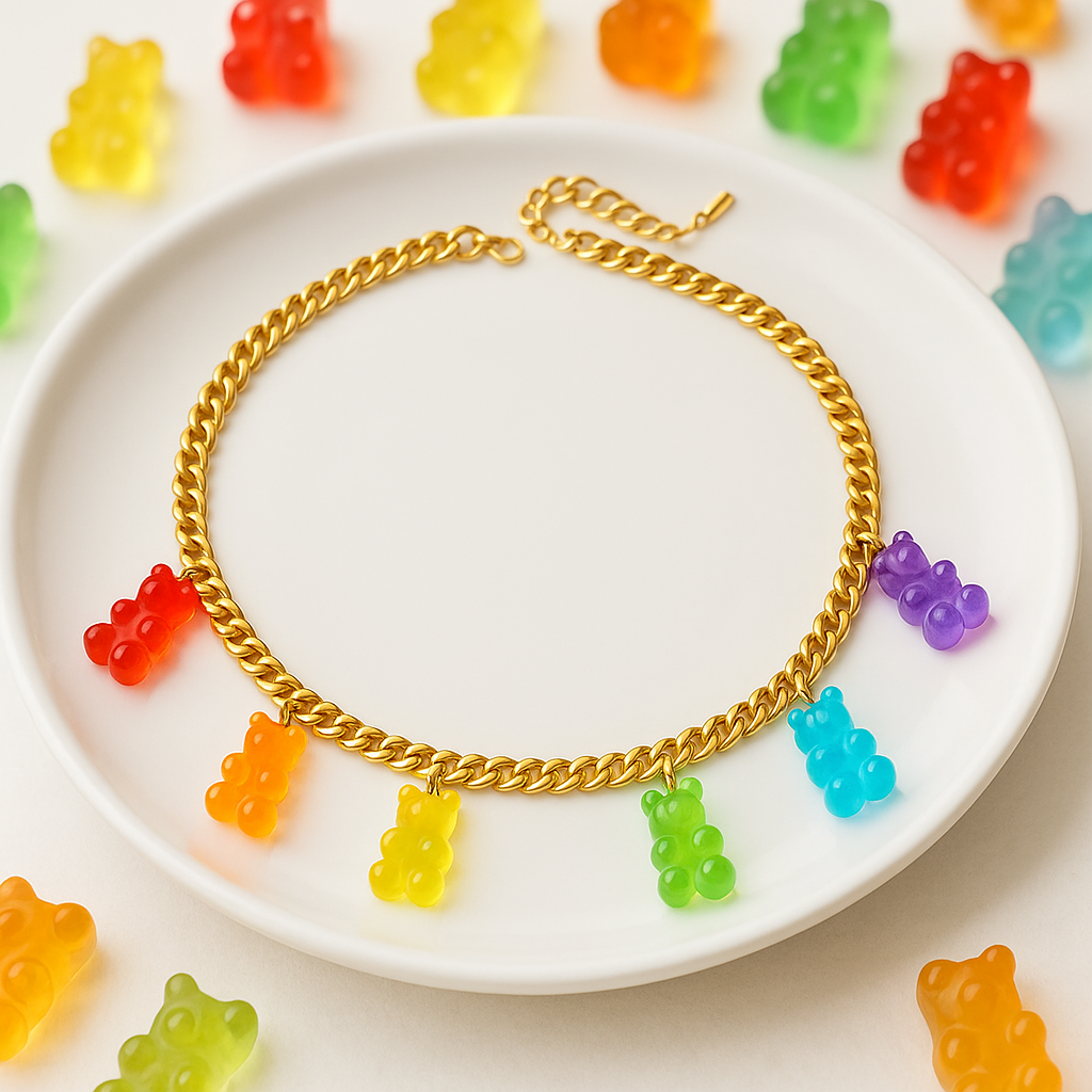 The Jelly Bear Necklace is a fun, vibrant statement piece inspired by your favorite childhood...