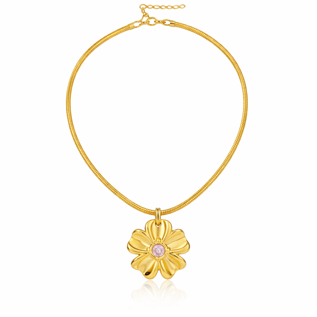 The Flora Necklace is a golden ode to romance and nature, featuring a radiant four-petal...