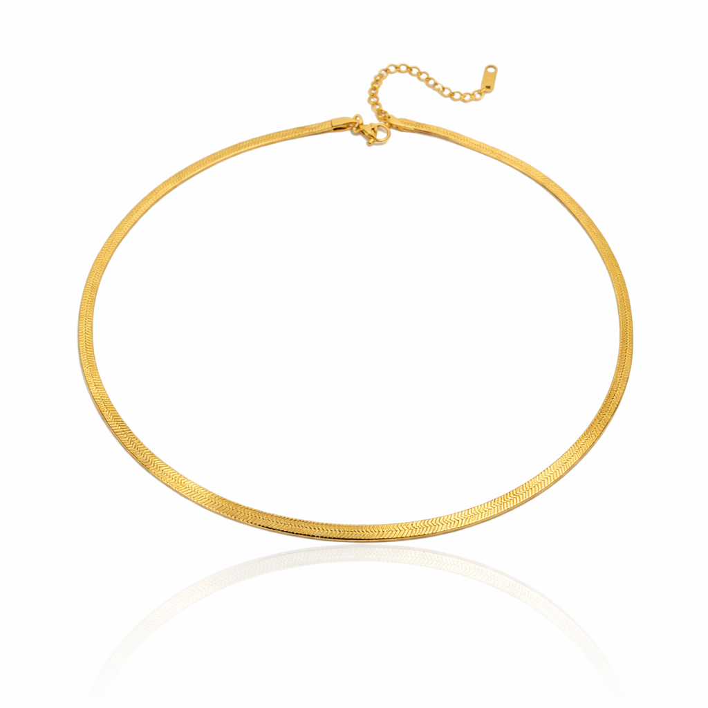 The classing Herringbone Chain features a sleek, flat gold design with a smooth, reflective finish...