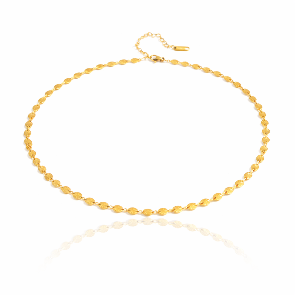 The Joyce Necklace features a delicate strand of finely engraved gold discs that catch the...