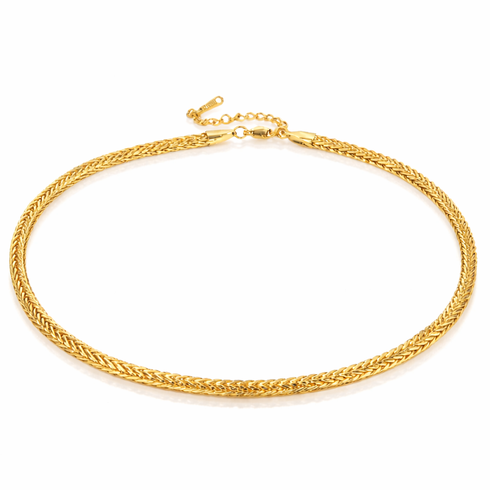 The Chiara Necklace features a beautifully woven gold chain design with a rich, polished finish...