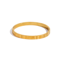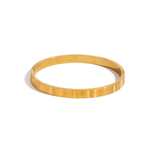 Elevate your everyday style with the Aitana Bangle, a sleek gold bracelet designed with a refined wave-engraved pattern that adds movement, warmth, and a touch of exotic elegance. Its polished finish and minimalist silhouette make it a versatile statement piece, perfect for layering or wearing on its own for a sophisticated, modern look.