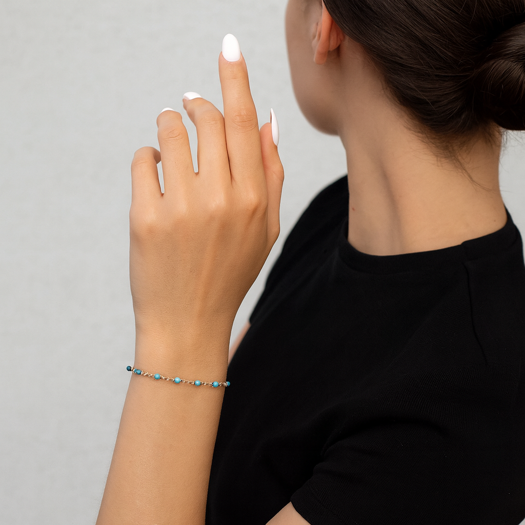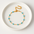 The Azul Bracelet features delicate turquoise-blue beads paired with polished gold accents, creating a soft, refreshing pop of color. Its dainty design adds a touch of effortless charm, perfect for stacking or wearing solo for a subtle statement. Lightweight, feminine, and easy to style, the Azul Bracelet brings a breezy, ocean-inspired elegance to any look.