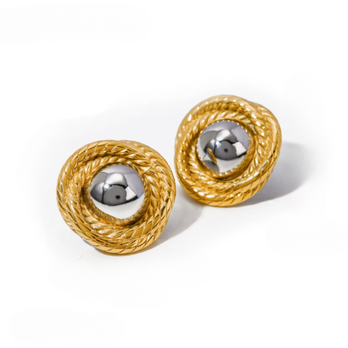 The Gwen studs embody timeless elegance with a modern twist. Featuring a textured gold rope design that frames a polished silver dome, the Gwen Earrings bring both depth and sophistication to any look. Their rounded silhouette and mixed-metal finish make them versatile enough for day or evening wear, while the secure stud backing ensures all-day comfort.