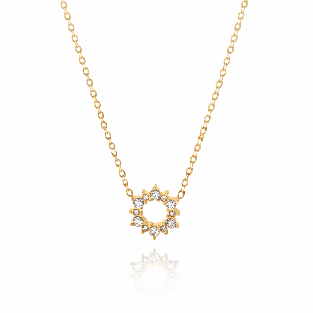 The Katie Necklace features a delicate open-circle pendant accented with shimmering crystal details for a soft, refined sparkle. Set on a fine gold chain, this piece is subtle yet eye-catching, making it perfect for everyday wear or effortless layering. Elegant and minimal with just the right touch of shine, the Katie Necklace adds a polished finish to any look.