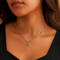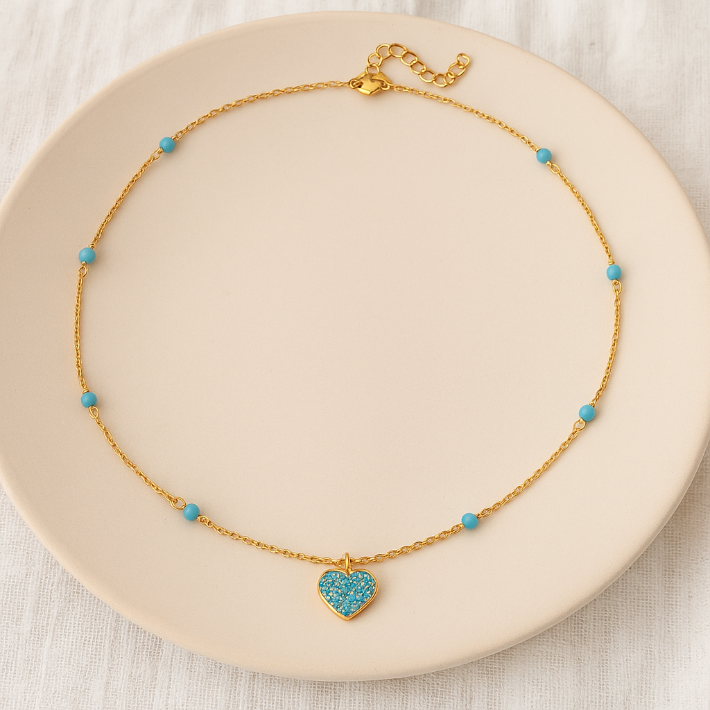 The Malani Necklace is a delicate blend of charm and sparkle, designed to bring a soft pop of color to your everyday style. Featuring a dainty gold-toned chain adorned with turquoise and white beaded accents, it’s finished with a heart-shaped pendant paved in shimmering aqua stones. Lightweight, waterproof, and hypoallergenic, Malani adds a sweet yet sophisticated touch whether worn alone or layered with your favorite pieces.