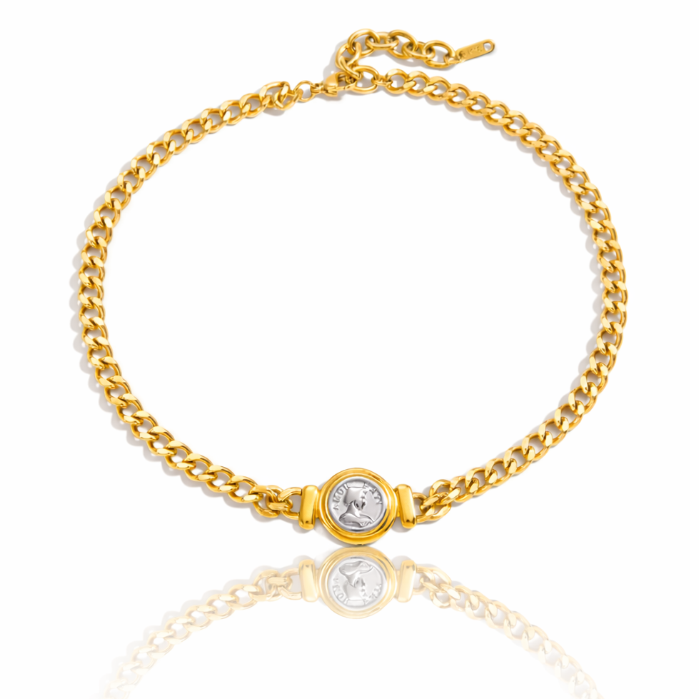 The Medallion Chain features a bold gold curb chain accented with a classic medallion centerpiece for a timeless, statement look. Inspired by vintage heirloom jewelry, this piece balances strength and elegance, making it perfect worn on its own or layered with finer chains. Polished and substantial, the Medallion Chain adds effortless impact to both everyday and elevated styling.