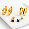 The Nightfall Trio features three versatile earring styles designed to elevate your everyday look. This curated set includes bold gold huggies, sleek black-stone hoops, and chic square onyx-inspired studs — each offering its own unique touch of sophistication. Wear them individually for a clean, minimal vibe or mix and match for an effortlessly modern stack. With water-resistant, hypoallergenic stainless steel, the Nightfall Trio combines durability with refined style, making it an essential addition to any jewelry collection.