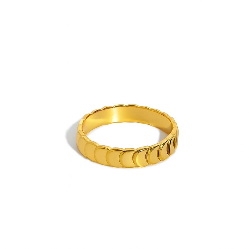 The Nura Band is a radiant symbol of understated elegance, designed with softly sculpted scalloped edges that shimmer with every movement. Its seamless, coin-like detailing reflects the light beautifully, giving the ring a warm, luminous finish that feels both modern and timeless. Lightweight yet substantial, this band works perfectly on its own for a refined touch or paired with other rings for a textured, effortless stack.