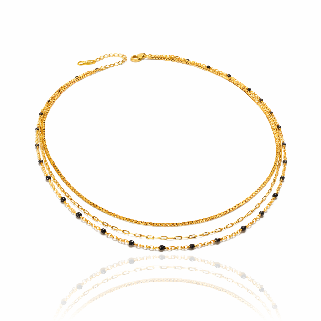 The Rekha Necklace features a striking trio of layered gold chains accented with subtle black bead details for a rich, dramatic contrast. Designed to create effortless depth and movement, this piece drapes elegantly along the neckline, blending classic beauty with an exotic edge. Bold yet refined, the Rekha Necklace is a statement piece that elevates both everyday styling and evening looks.