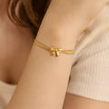The Rosabella Bow Bracelet brings a sweet, romantic touch to your everyday style. Designed with two delicate gold chains and finished with a pink enamel bow charm, it adds the perfect hint of softness and shine. Lightweight, dainty, and charming, this bracelet layers effortlessly with other pieces or stands out on its own as a subtle statement of elegance. A lovely pick for anyone who loves girly, polished details.