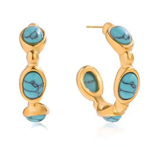 The Serena Earrings capture the essence of refined artistry with their turquoise stone detailing and radiant gold finish. Combining vibrant color with timeless structure, these hoops bring a touch of elegance and individuality to any outfit. Perfect for adding a hint of luxury and personality, they effortlessly elevate both casual and evening looks with their unique charm.