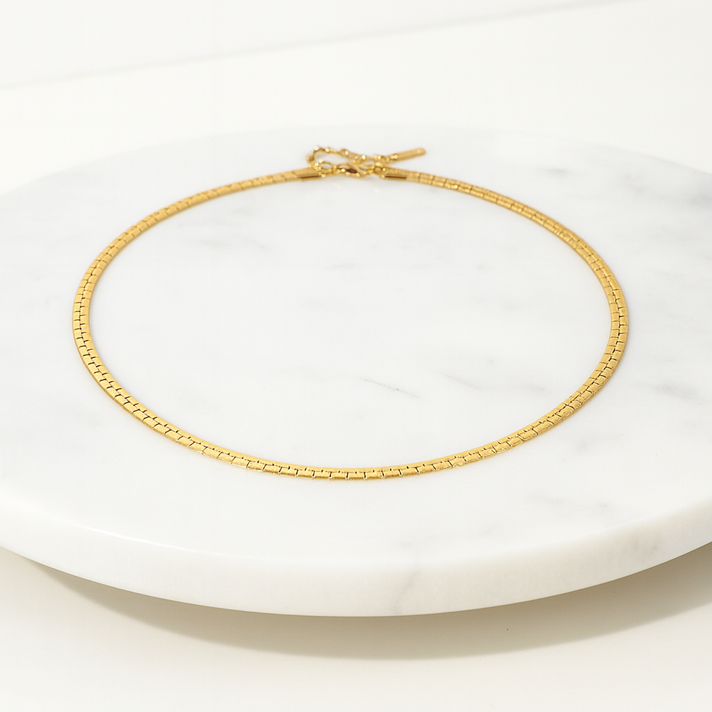 The Kavita Necklace is a sleek and modern staple designed for effortless, everyday elegance. Crafted with a polished, box-style chain, it sits beautifully along the neckline—simple enough to layer, yet bold enough to wear on its own. Its smooth, fluid texture catches the light with every movement, adding a refined touch to any outfit. Waterproof, hypoallergenic, and tarnish-resistant, this necklace is made for daily wear without the worry.