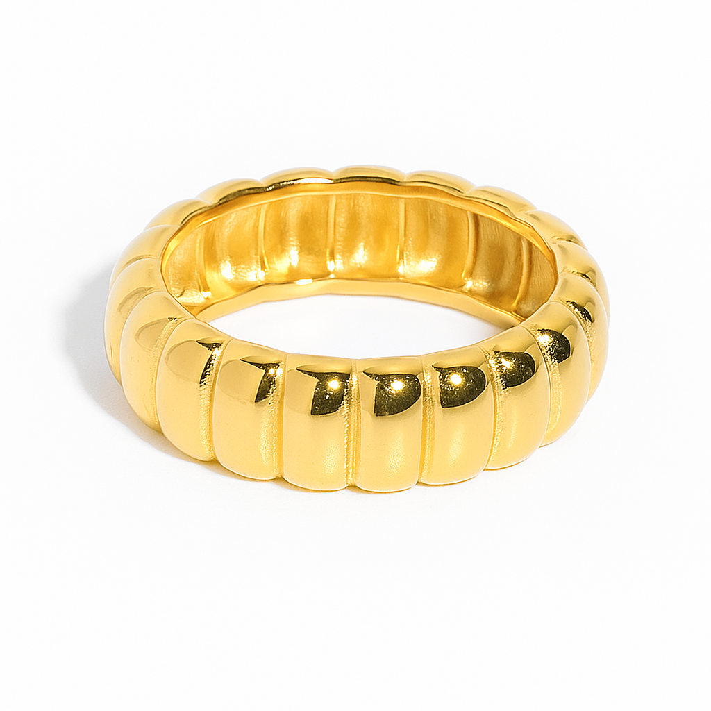 Bold and radiant, the Zuri Band embodies strength and beauty in perfect harmony. Inspired by the Swahili word “Zuri,” meaning beautiful, this sculpted 18K gold-plated ring features a smooth ribbed texture that catches light with every movement. Its timeless design and rich golden hue make it a statement of confidence, grace, and cultural elegance—perfect for elevating any look, day or night.